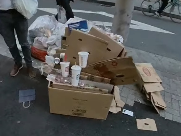 Sometime one would see cardboard boxes outside storefronts ( or houses ). This is because it it likely the day cardboard boxes are to be picked up. In this case unfortunately, some people put their unwanted trash on them thinking that it is some kind of garbage bid.